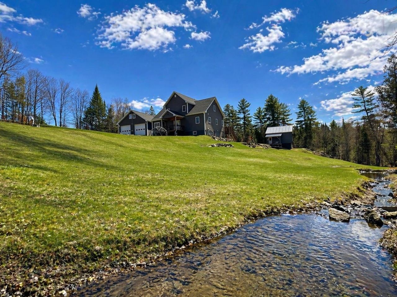 Professionally crafted in 2018 and thoughtfully designed for modern living, this expansive 3-level residence is set on 12.27 private acres just minutes from town conveniences. Offering a seamless blend of comfort, function, and NEK lifestyle, the property invites you to live with ease. The main level showcases an open-concept layout ideal for entertaining, featuring a generous kitchen designed for baking & hosting, a spacious living area, and direct access to a large rear deck overlooking the peaceful wooded surroundings. The primary suite is conveniently located on the main floor and includes a walk-through closet and an ensuite bath complete with a soaking tub & oversized walk-in shower. A guest half bath completes this level. The second floor offers two additional bedrooms, a full bath, playroom and a dedicated home office- providing flexible space for work or creativity. The finished walkout lower level expands the living area with a game room, bonus room & half bath, ideal for guests or multi-generational living. A heated attached two-car garage includes a studio apartment above, currently generating $1,000 per month in rental income. A detached three-car garage provides additional storage or hobby space. Outdoor features enhance the property's appeal, with frontage along Fall Brook, a connecting stream with a kidney-shaped wade pool for summer enjoyment. VAST trail access is available from the adjoining property, and Interstate 91 is just a short drive away. Don't miss this rare opportunity to own a modern, easy-to-live-in retreat in the heart of the Northeast Kingdom.
